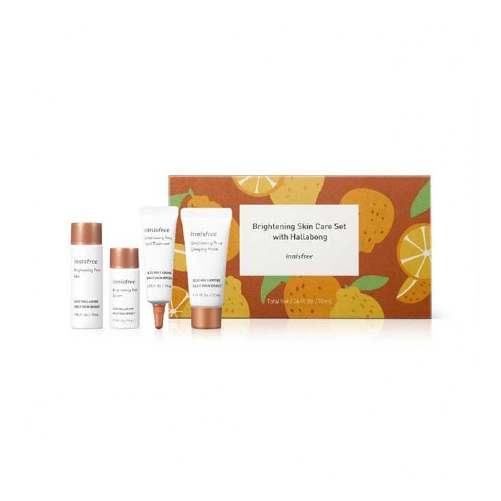 Daily brightening toner that helps to soothe skin and hydrate for a softer skin with a fresh feel.Daily brightening serum formulated with Hallabong peel extract and vitamin derivatives helps with hydration, brightening care and pores for a softer feeling skin.Daily brightening spot corrector that visibly reduces the look of dark spots for a clearer skin.Daily brightening sleeping mask that forms moisture barrier throughout the night with hydration, brightening and tighter pores for a softer skin without stickiness.